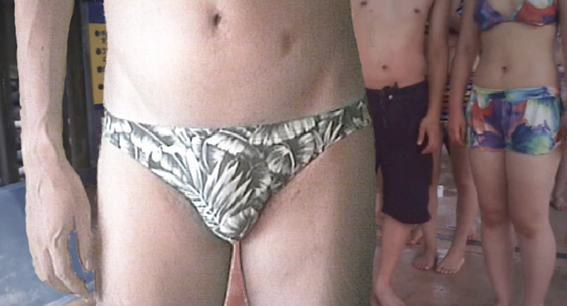 そう言われて、部屋に帰って試着してみると、学校指定のものより随分小さいタイプでした。僕は、中1からビキニブリーフを穿かされていましたが、まだこんなピチピチの海パンは穿いたことがありませんでした。こんなのを穿いてプールに行くと思うと、すごくエッチな気分になって、勃起しそうになりましたが、アンダーショーツもあったので少し安心しました。